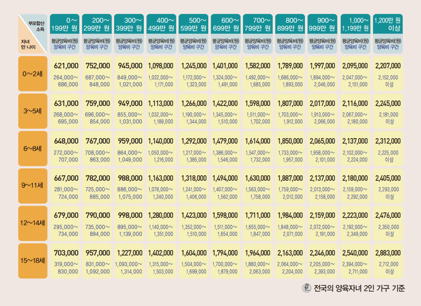 2025 양육비 산정기준표는 자녀 연령과 부부의 합산 소득에 따라 월 기준 양육비를 책정하는 방식입니다. 서울가정법원이 제시한 기준표에는 자녀 연령대를 0~2세, 3~5세, 6~10세, 11~13세, 14~17세 등으로 나누고, 월 합산소득 구간별로 권장 양육비가 다르게 표시되어 있습니다. 이는 협의 이혼, 재판상 이혼, 양육권 분쟁 시 양육비 산정 기준으로 활발히 사용됩니다.